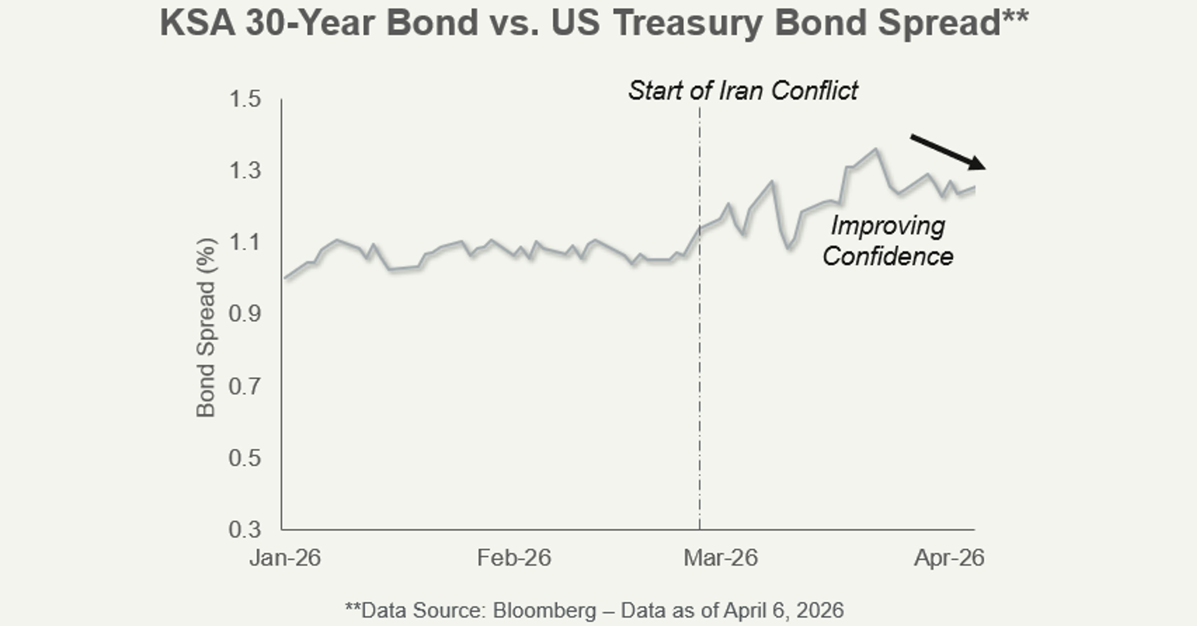 The strong recovery in the TASI coupled with the lowering in KSA’s 30-year bond spread to US treasury bonds in the aftermath of the conflict reflect the economy’s resilience despite unprecedented regional disruptions.